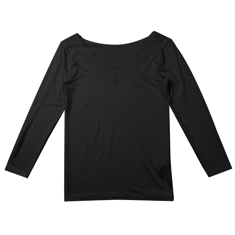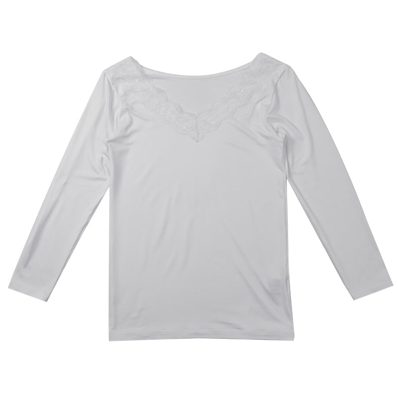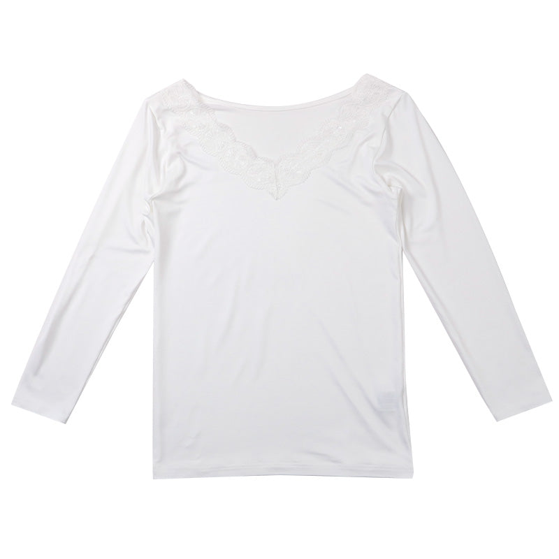 ピーチ起毛でほんのり暖かく心地よい、レディース 8分袖 フロントVレースインナー です。