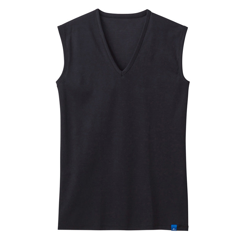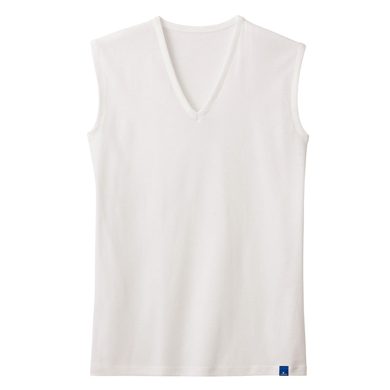 綿100%なのに冷感タッチを実現したメンズVネックスリーブレスシャツです