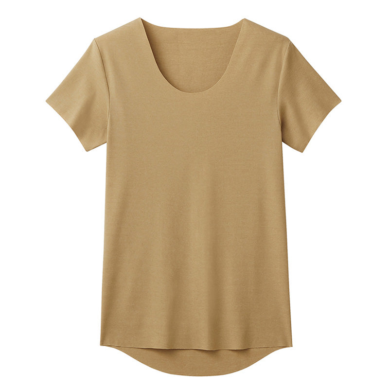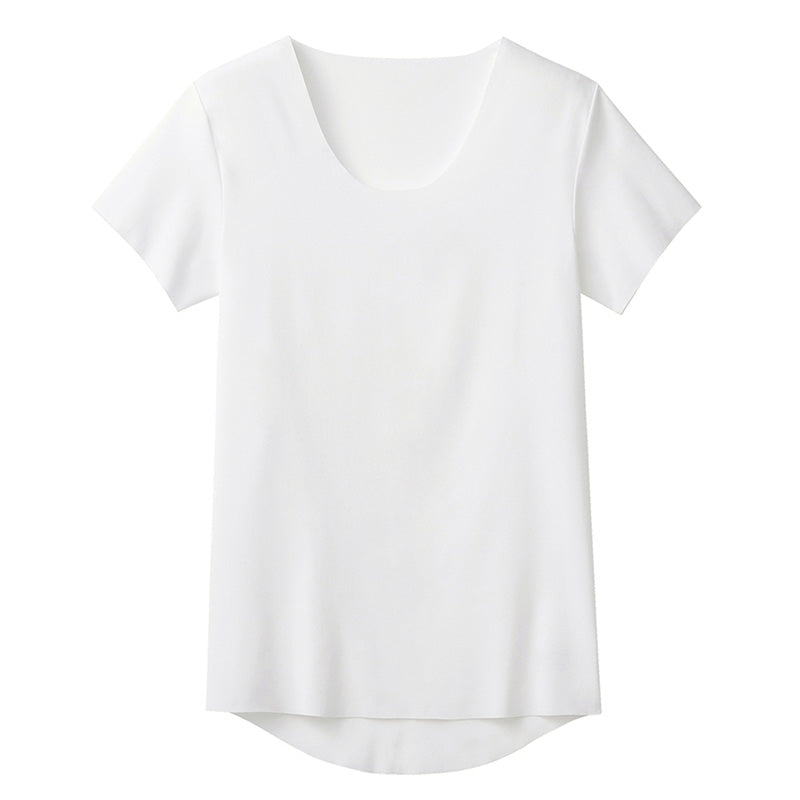 襟元からインナーが覗きにくいネックラインと、かがんでも背中が見えにくい後ろ丈長めの立体前後設計。