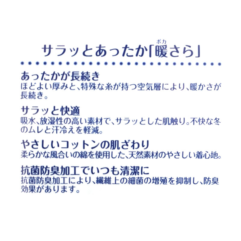 吸水、放湿性の高い素材で、サラッとした肌触り。不快な冬のムレと汗冷えを軽減。