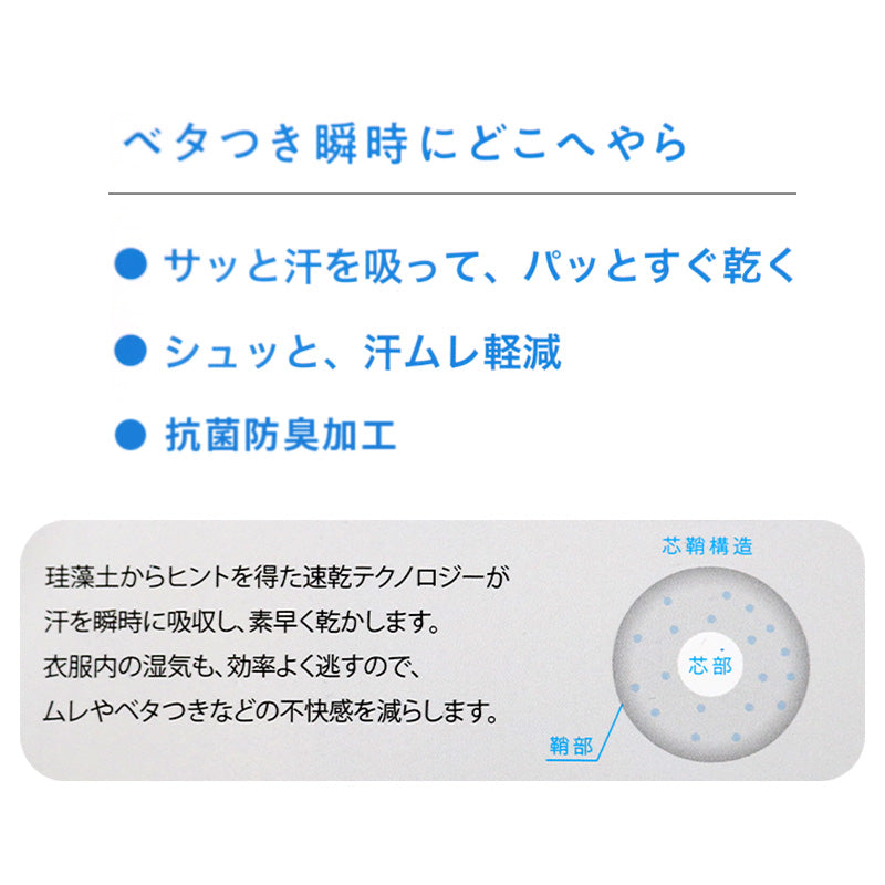 速乾テクノロジーがムレやベタつきなどの不快感を軽減し、汗をかいてもサラサラ!