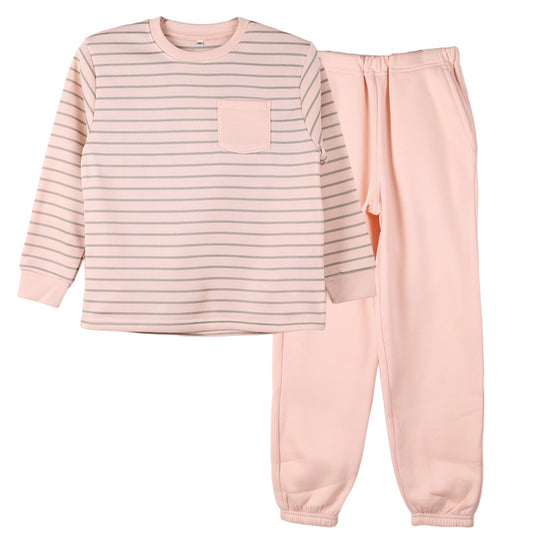 裏起毛 ルームウェア パジャマ 女の子 長袖 ボーダー柄 女児 子供 キッズ ジュニア 上下セット 130 140 150 160 cm セットアップ トレーナー ガーイズ あったか 暖かい 保温 防寒 秋冬 冬 長ズボン ポケット付き 冬用 部屋着 (在庫限り)