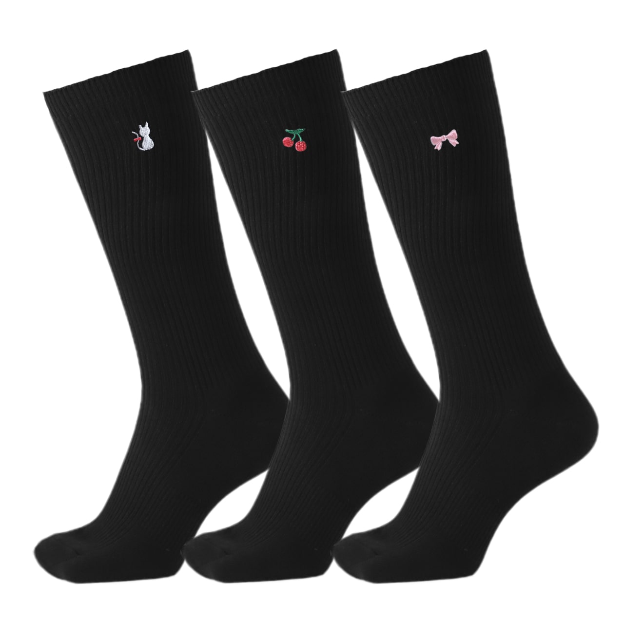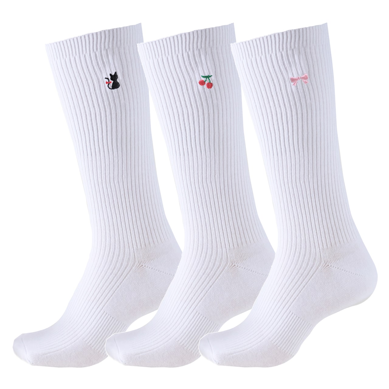 スクールソックス ワンポイント 3足セット 女子 靴下 通学 スリークォーター丈 14-16cm~18-20cm 白 紺 黒 短め ハイソックス 小学生 中学生 学校 子供 キッズ 両面刺繍 かわいい 通園