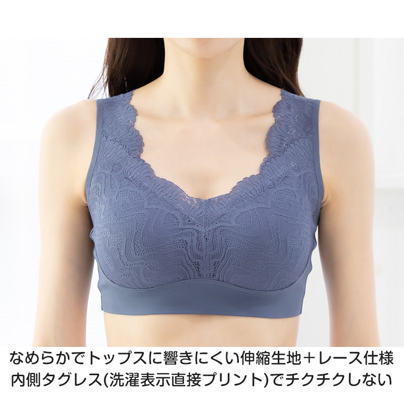 パッド取り外し可能/やや盛りやわらかパッド(パッドポケット無し)/ノンワイヤー/フロントレース仕様/洗濯表示直接プリント(タグレス・タグ無し)/後ろホックなし/内側縫い目なし