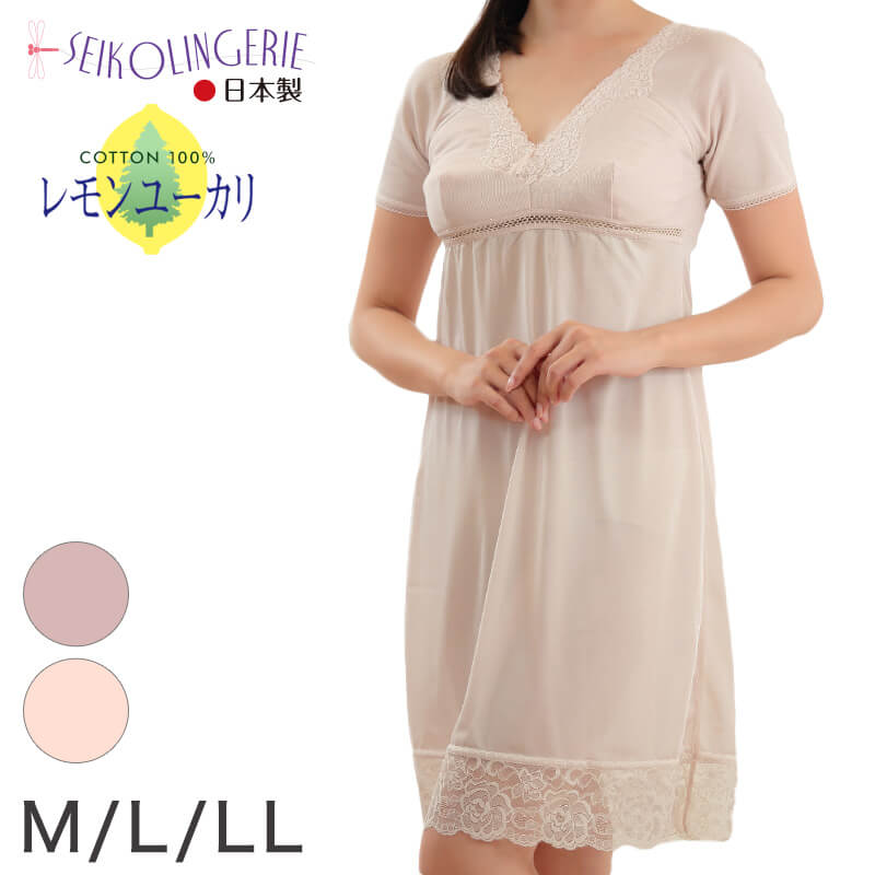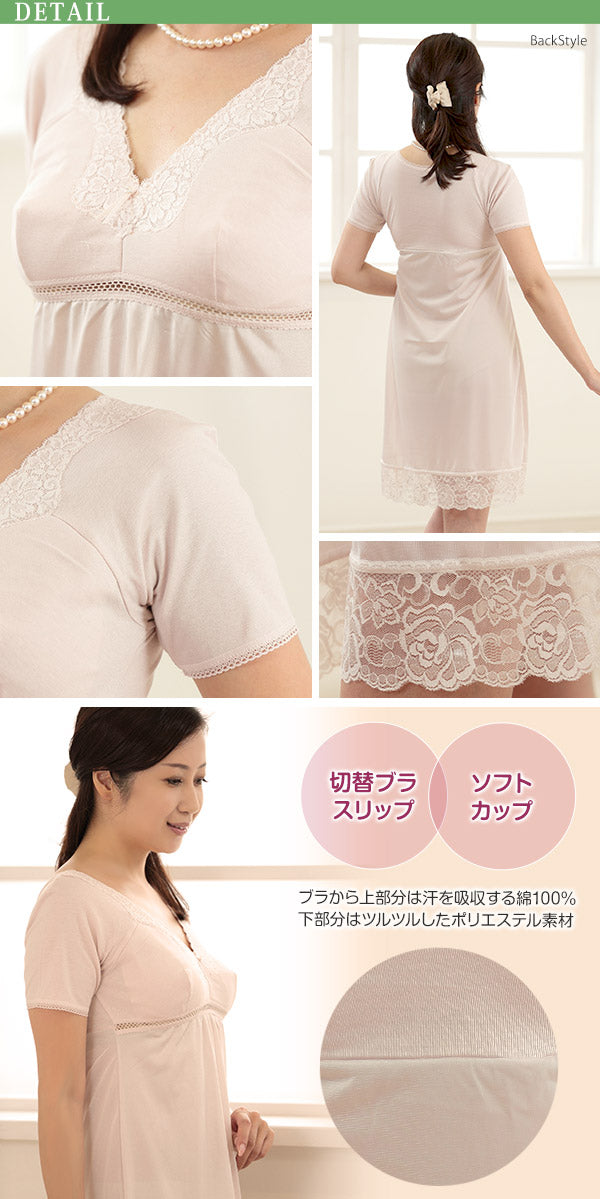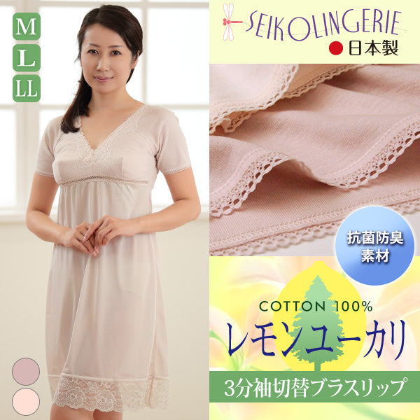 カップ付き スリップ 半袖 綿100% M90~LL95 (インナー ワンピース ロング ひざ丈 ランジェリー 下着 肌着 レディース 透け防止 3分袖 日本製 シュミーズ) (在庫限り)
