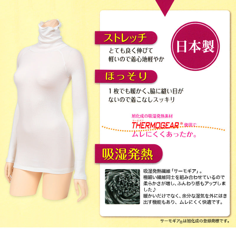 旭化成のサーモギア(吸湿発熱糸)を使用している発熱インナー。秋冬の防寒アイテムとしておすすめです。
