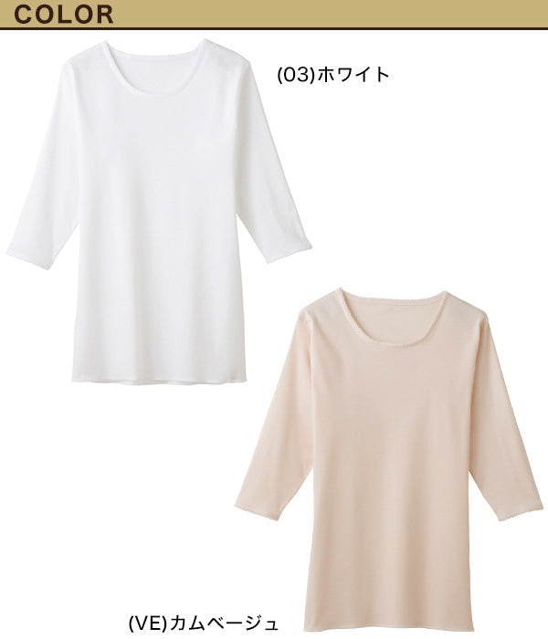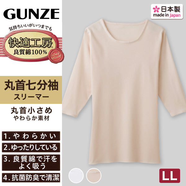 グンゼ 快適工房 婦人 7分袖丸首シャツ LL (レディース スリーマー GUNZE 綿100% クルーネック 女性 下着 肌着 インナー 白 ベージュ やわらか 日本製 大きいサイズ)