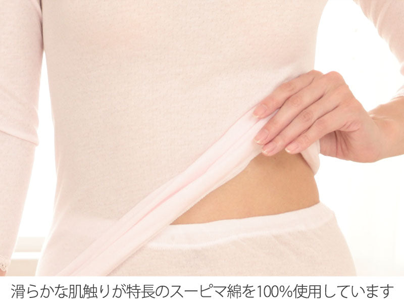絹のような美しい光沢感があるスーピマ綿を使用。なめらかでやわらかい肌触りのコットン100%インナーです。