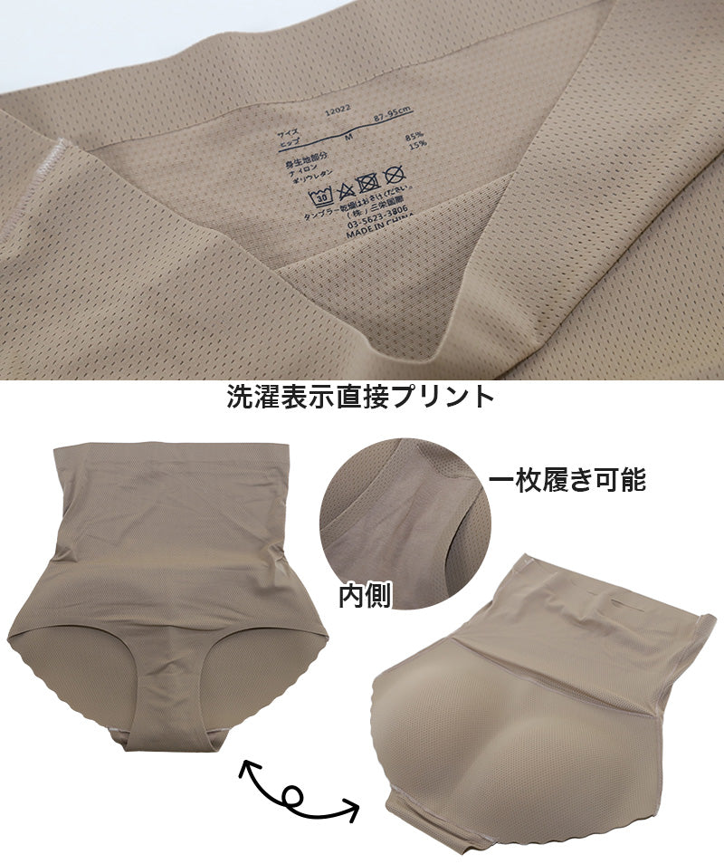 美尻パッド取外し不可(肉厚パッド)/通気性あり/一枚履き可能(直ばき用)/はき込み深め(股上長め)