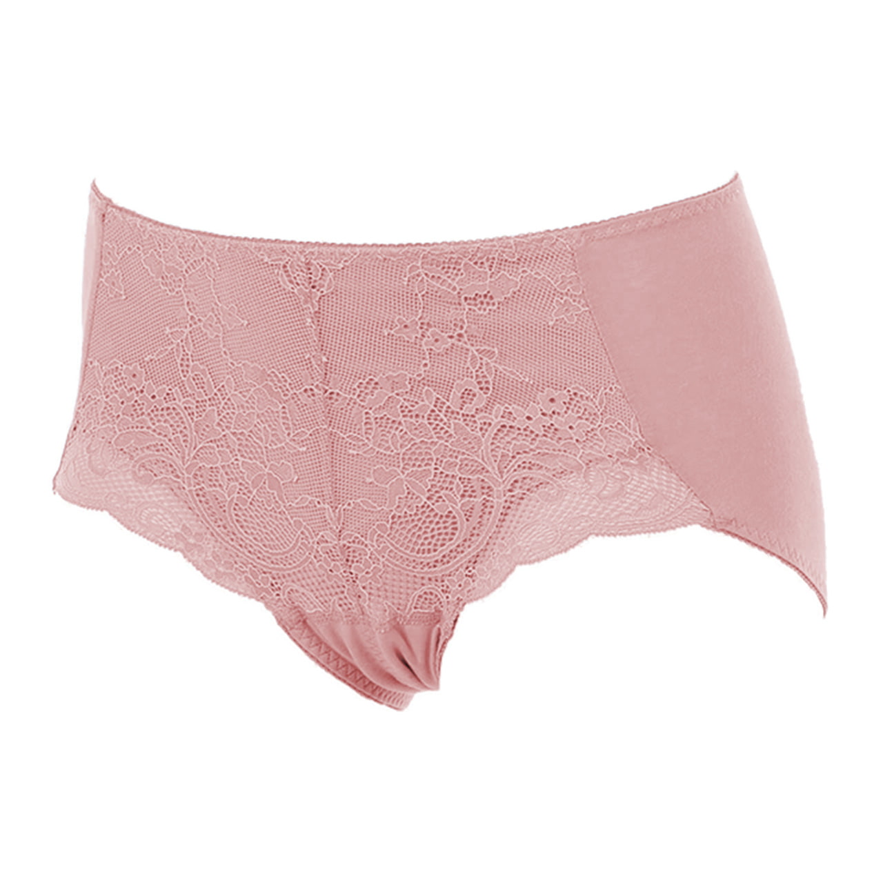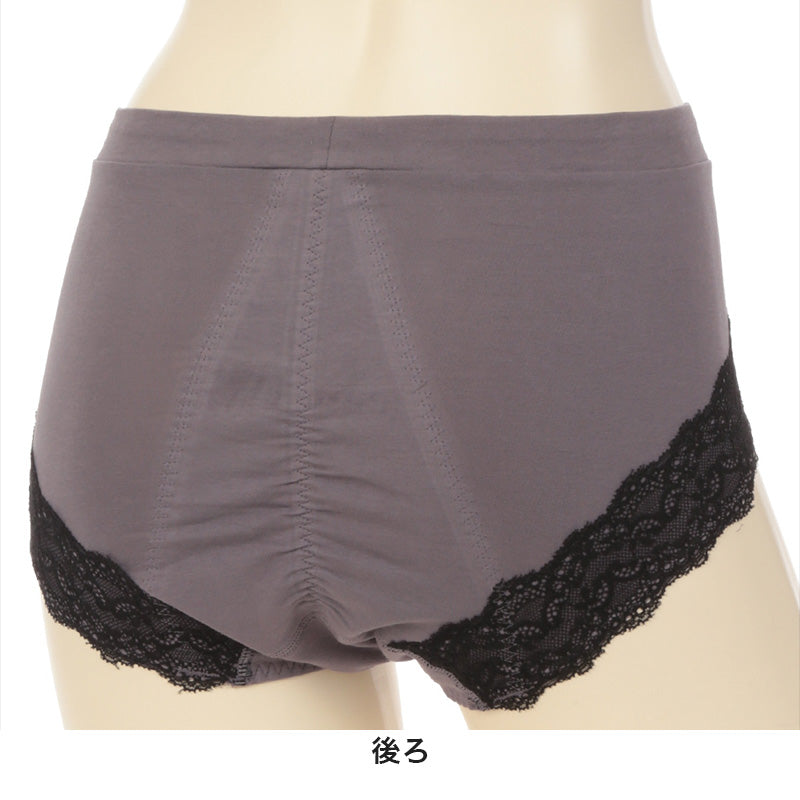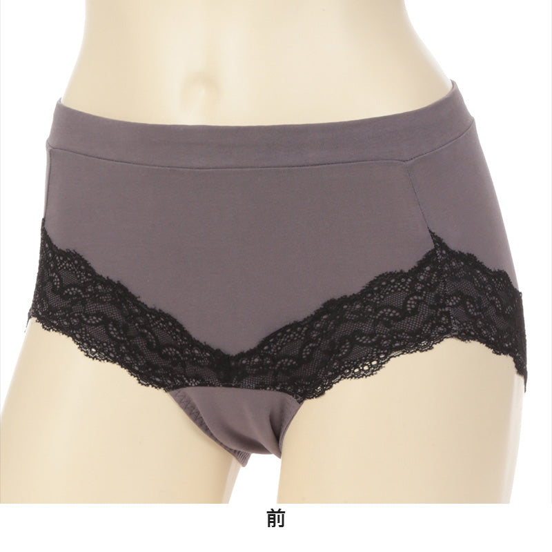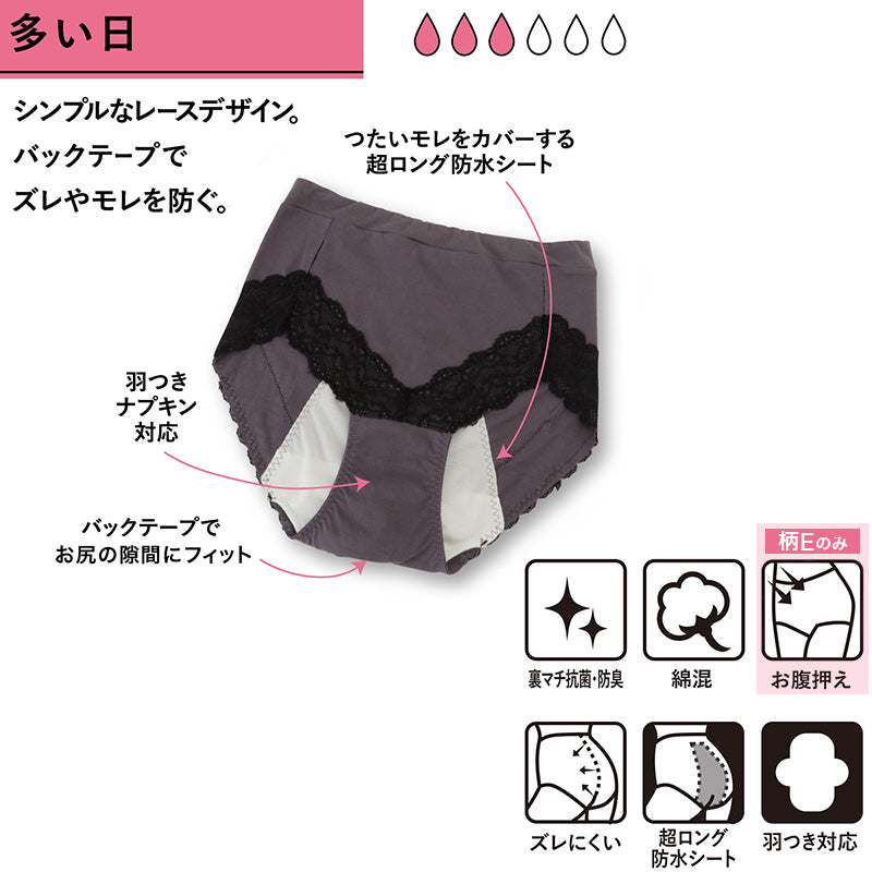 おなか押えできれいなシルエット。レース付きで華やかな超ロング防水シートサニタリーショーツです。