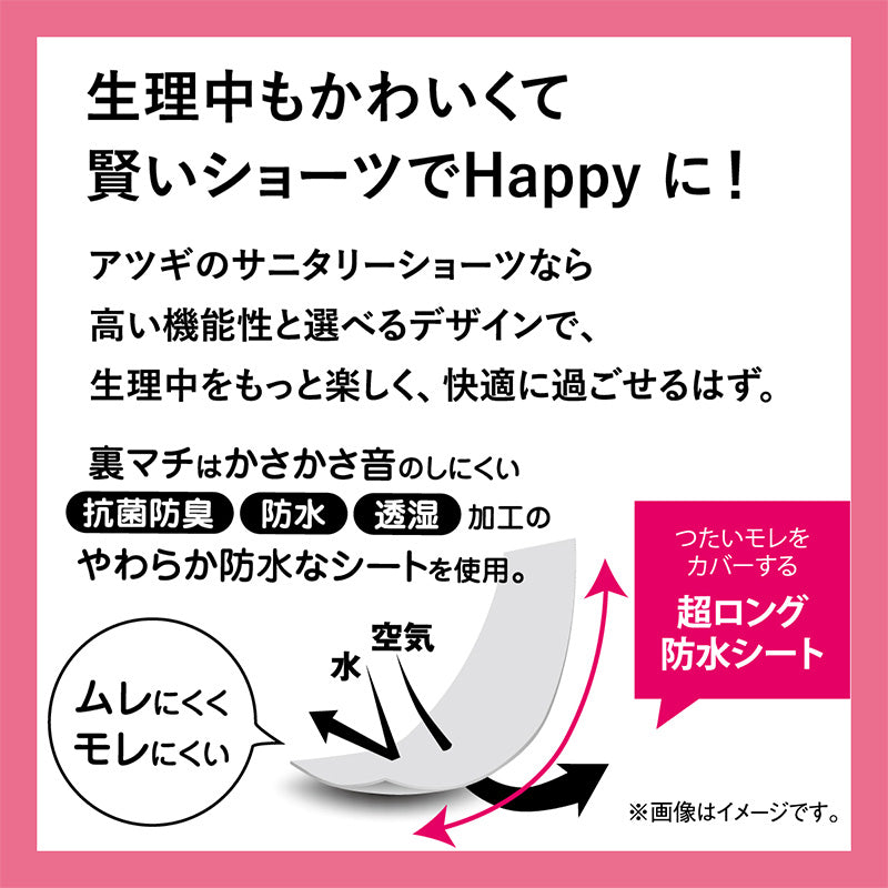 こちらのショーツは透湿加工された通気性のよい防水シートを使用しており、蒸れにくいのでブルーデイも快適に過ごせます。
