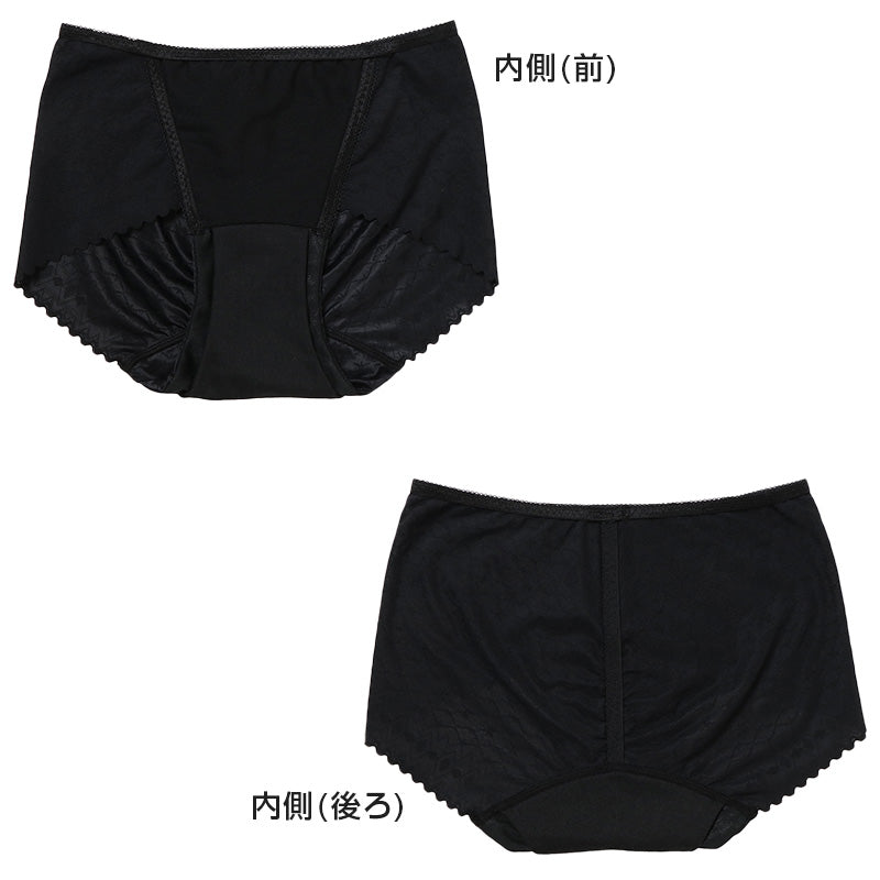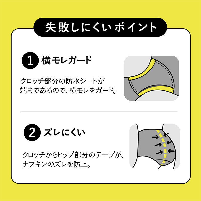 浮きクロッチ(マチ)仕様で羽根つきナプキンに対応しており、マチに折り込んで収納できてナプキンがズレにくいので横モレの心配がありません。