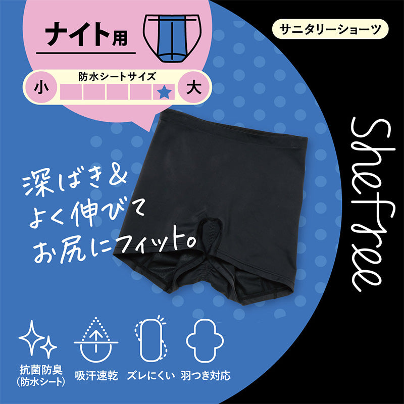 不安な夜も心強い「ズレない、ムレない、ロング防水シート」の機能がついた生理用ショーツです。