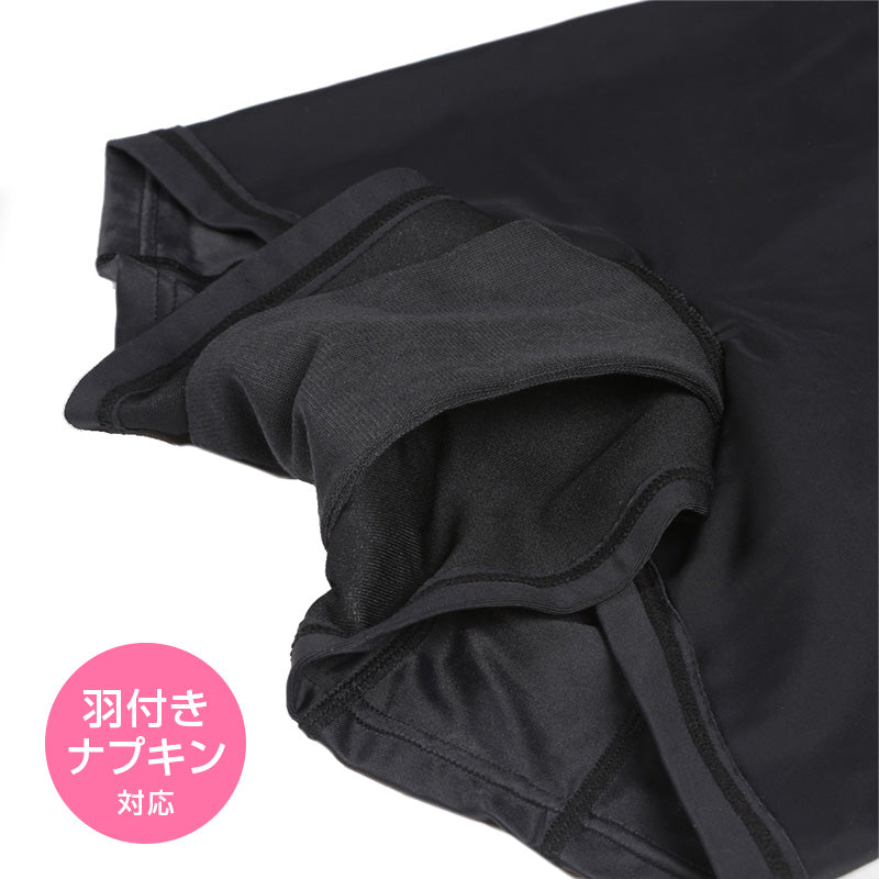 吸汗速乾、ヒップ立体裁断、羽つきナプキン対応、横モレガード仕様、後ろつたいモレブロック仕様、普段ばきできるクロッチ、クロッチテープ、バックテープ、かさかさ音のしにくい防水シート(抗菌防臭加工/防水加工/透湿加工)