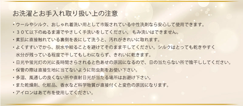 シルク特有のすべすべとした滑らかな肌触りと美しい光沢はそのままに、綿のような着やすさがあり、シワにもなりにくい肌着です。