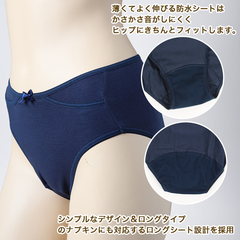 ややワイドな防水シートで大きめのナプキンにも対応した生理用ショーツです。シンプルなデザインで、マチ部分も黒なため経血モレが目立たない点がうれしいポイント。