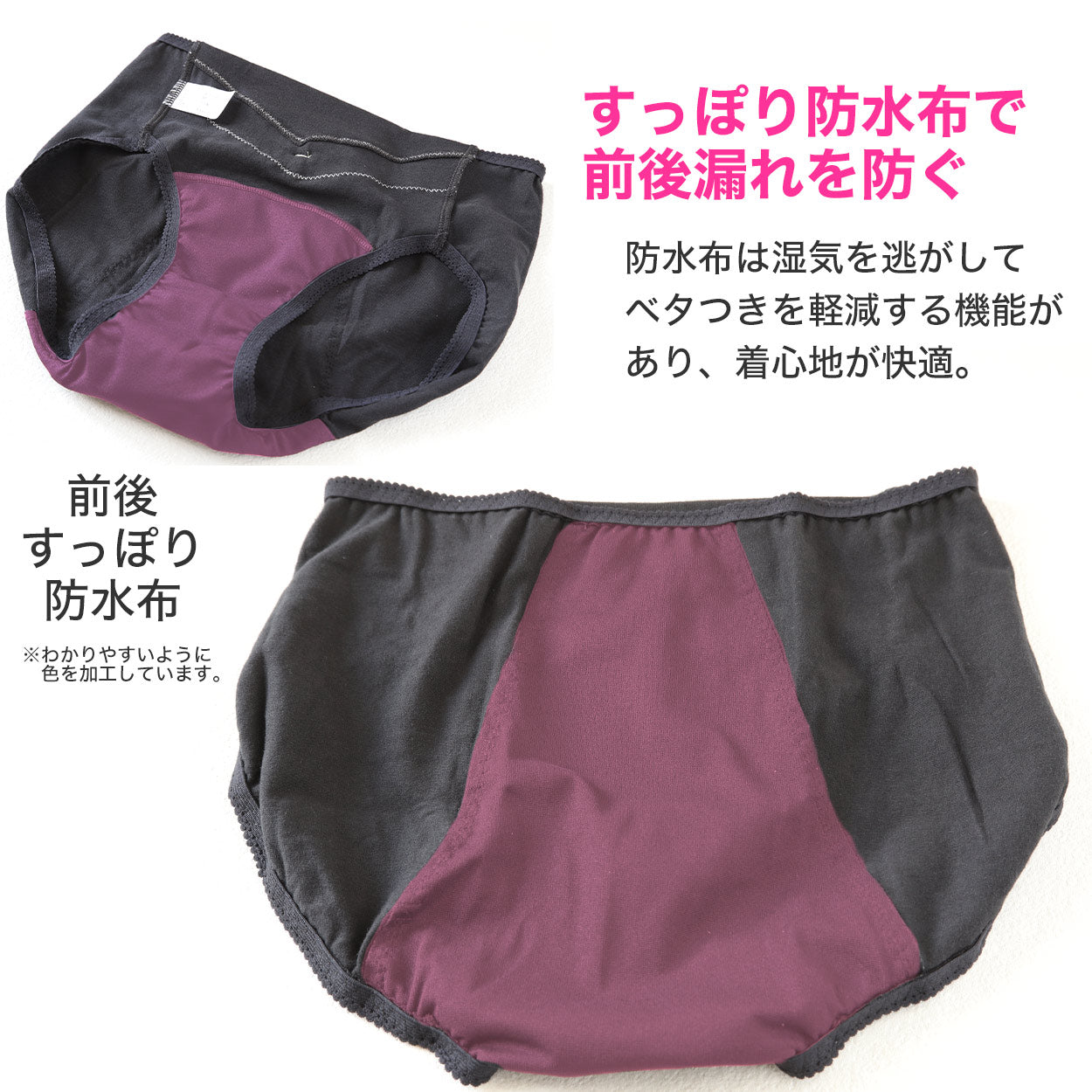 ◆防水布は前からおしりの方まですっぽりカバー。前漏れと後ろ漏れも防ぎます。