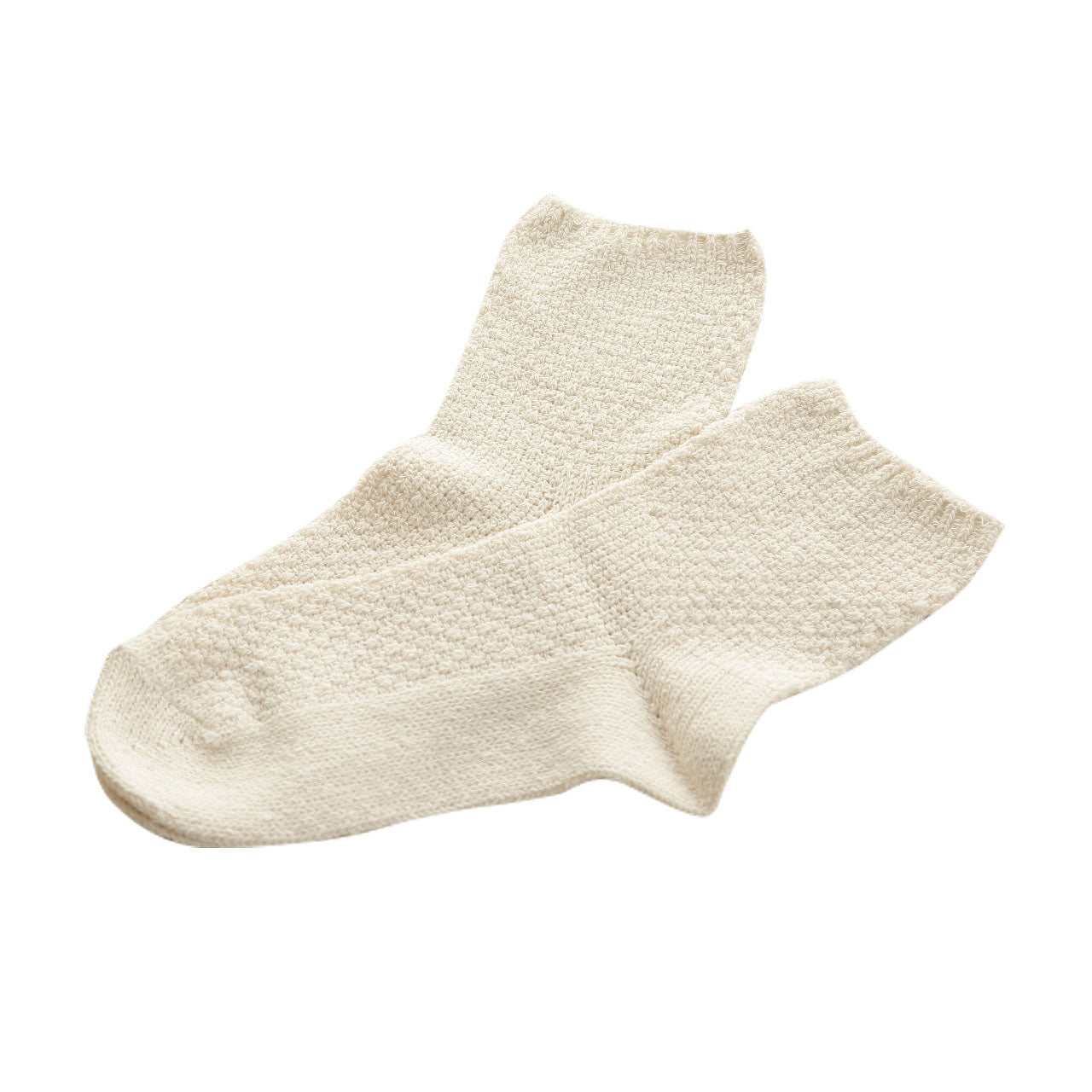 シルクを使った素朴な風合いの足首丈かのこ編みソックスです。