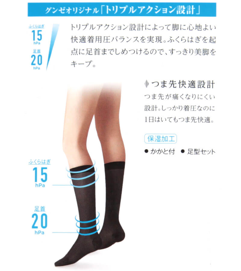 トリプルアクション設計によって脚に心地よい快適着用圧バランスを実現。ふくらはぎを起点に足首までしめつけるので、すっきり美脚をキープ。