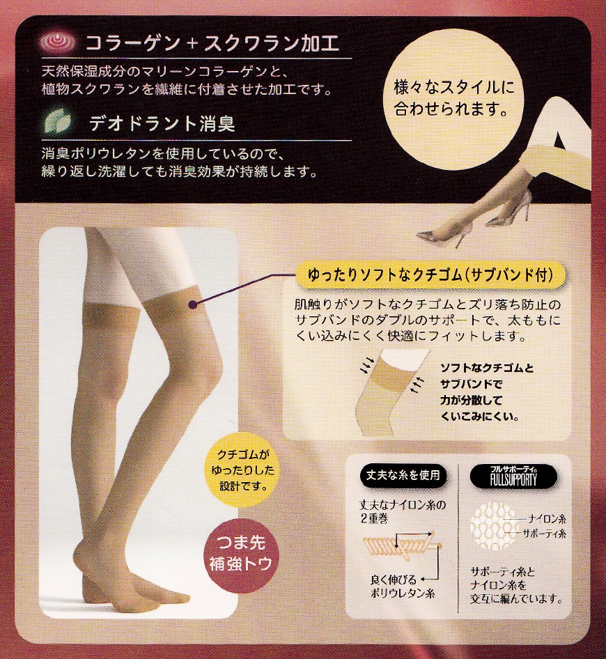 コラーゲン+スクワラン加工/デオドラント消臭(消臭ポリウレタン)/つま先補強トウ/フルサポーティ