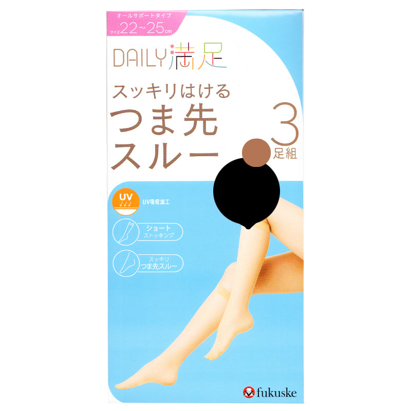 福助 ショート ストッキング 膝下 つま先スルー 3足組 22-25cm ひざ下 UV 紫外線 黒 ベージュ レディース 抗菌 防臭 (在庫限り)