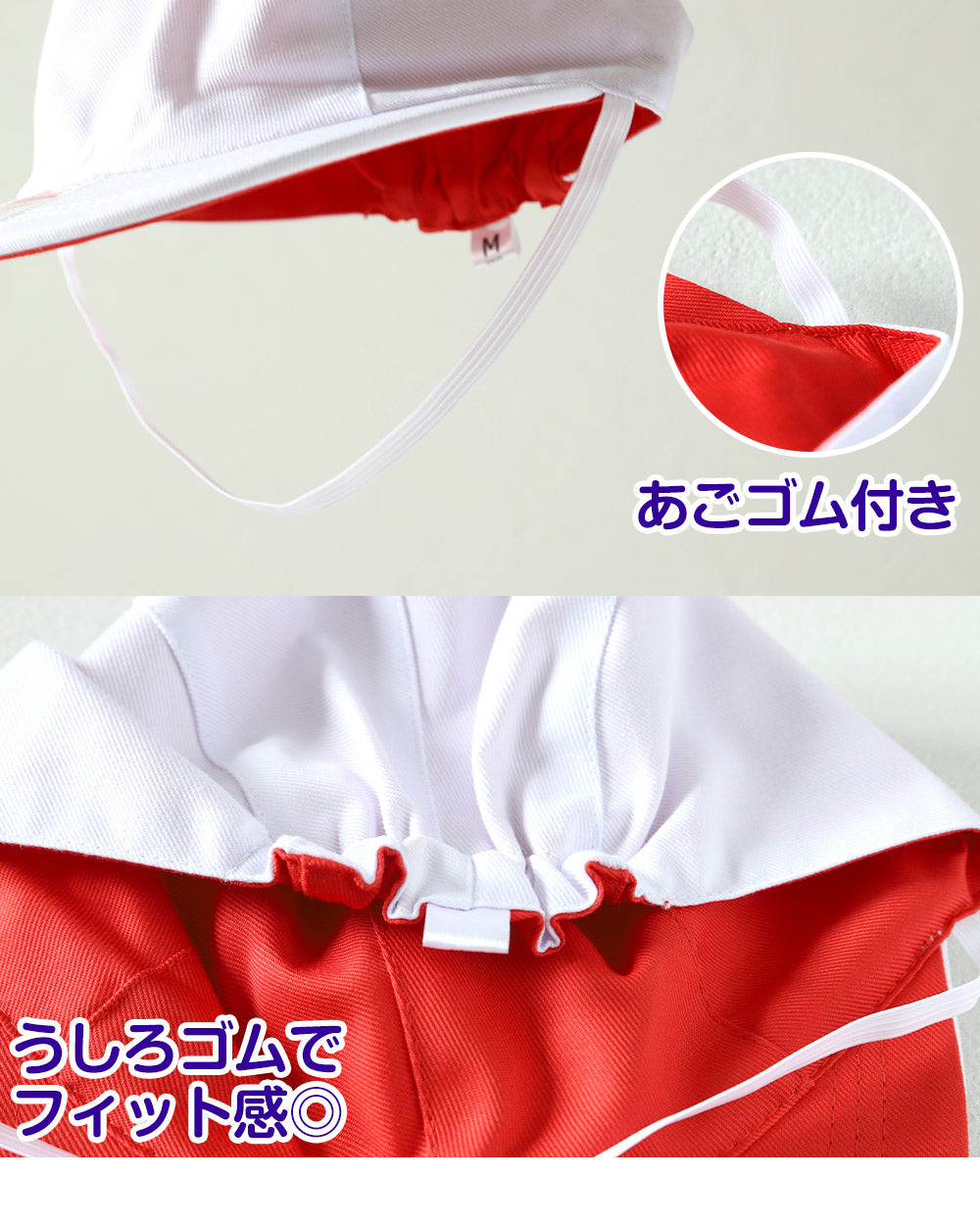白色が表で裏側が赤になっている、運動会や小学校の体育の授業、遠足で活躍する定番スタイルの体操帽子。