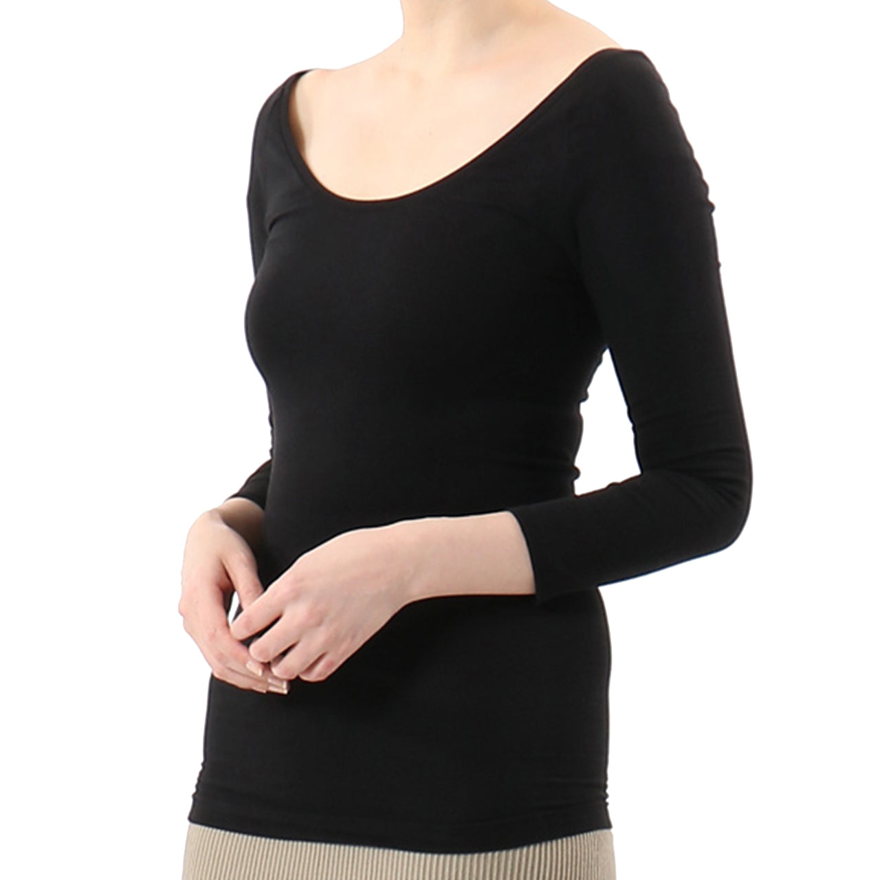 ヘインズ インナー レディース 長袖 シャツ 襟ぐり 広め フリーサイズ (下着 tシャツ 9分袖 白 黒 無地 綿混 コットン ストレッチ hanes) (在庫限り)