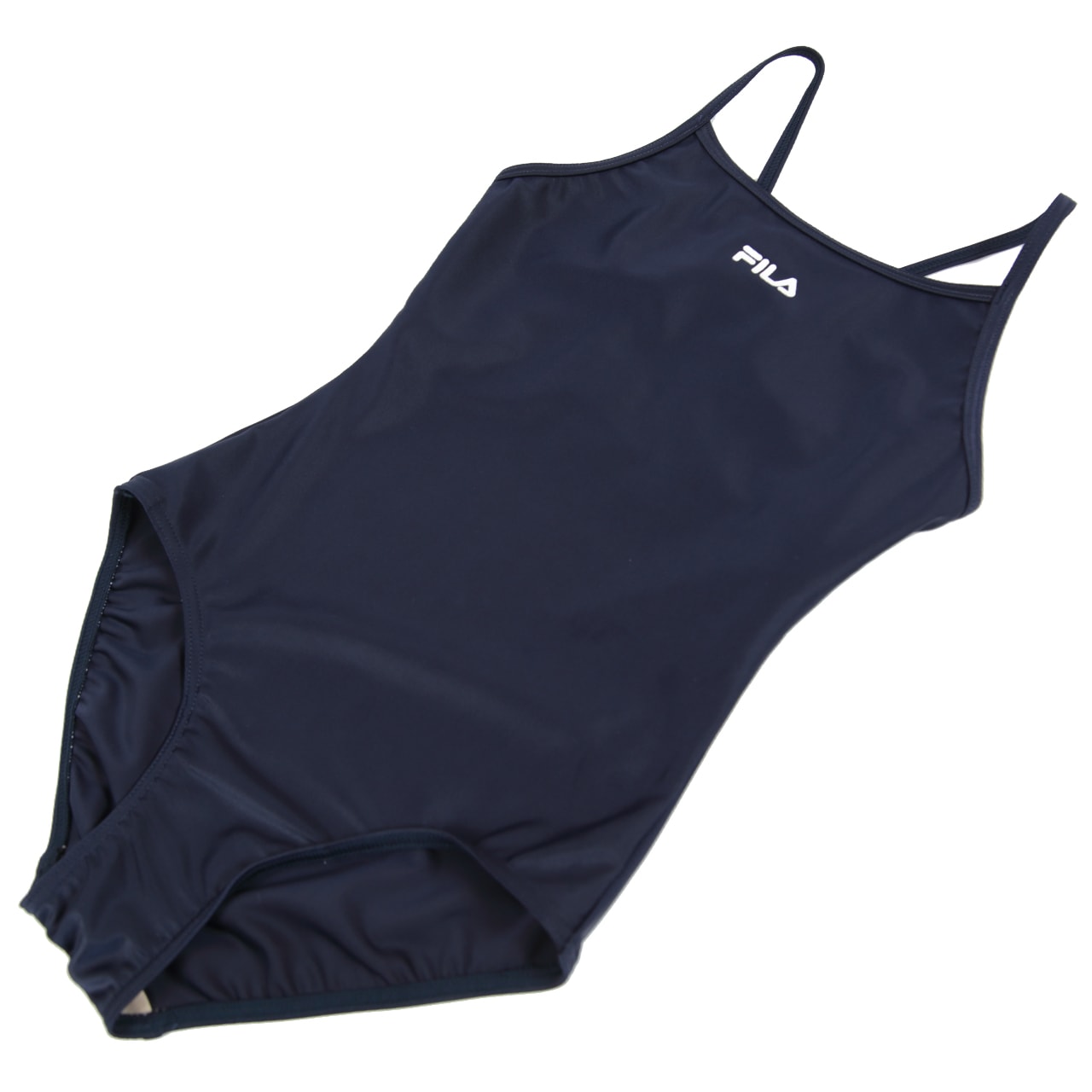紺地がベースで、肩ひもが選べる2カラー、胸にFILAのロゴが入ったアクティブな水着です。