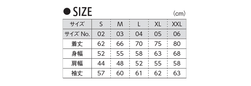 XL(着丈:75cm/着幅:63cm/肩幅:55cm/袖丈:62cm)