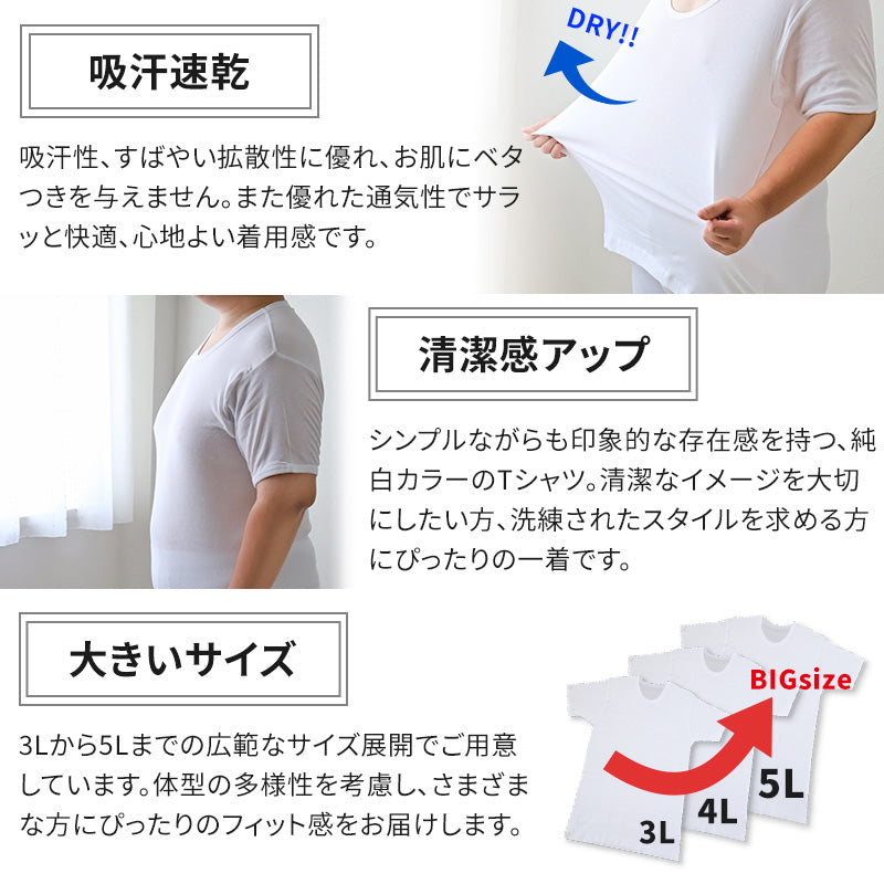 大きいサイズ 半袖 丸首 クルーネック メンズ 綿100 3L~5L (吸水速乾 コットン ビッグ ロング 大寸 白t 大きめ でかい ぽっこり 肥満 マッチョ 筋肉 体型カバー 3L 4L 5L)
