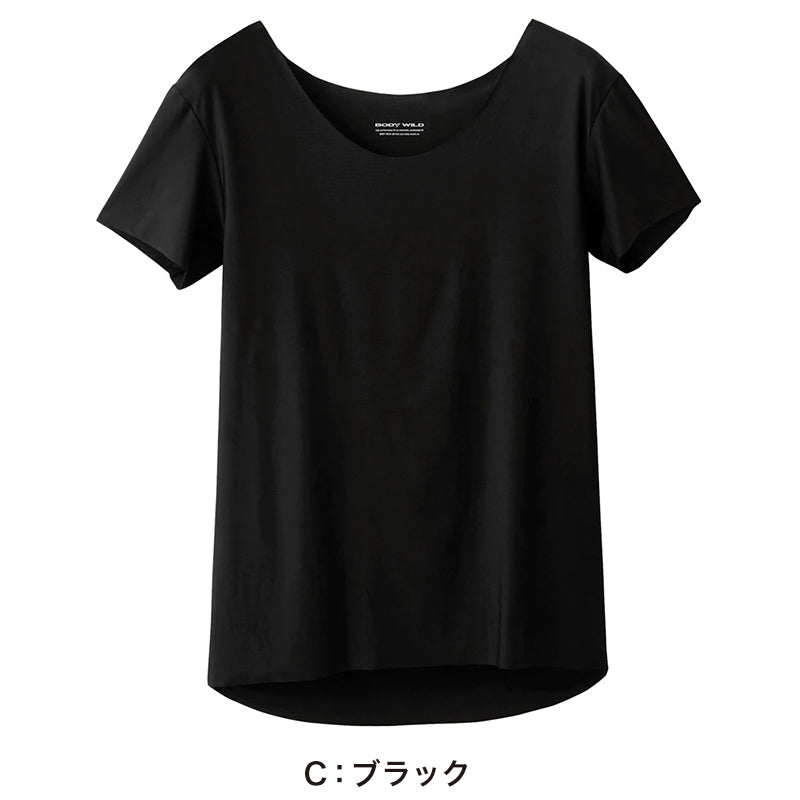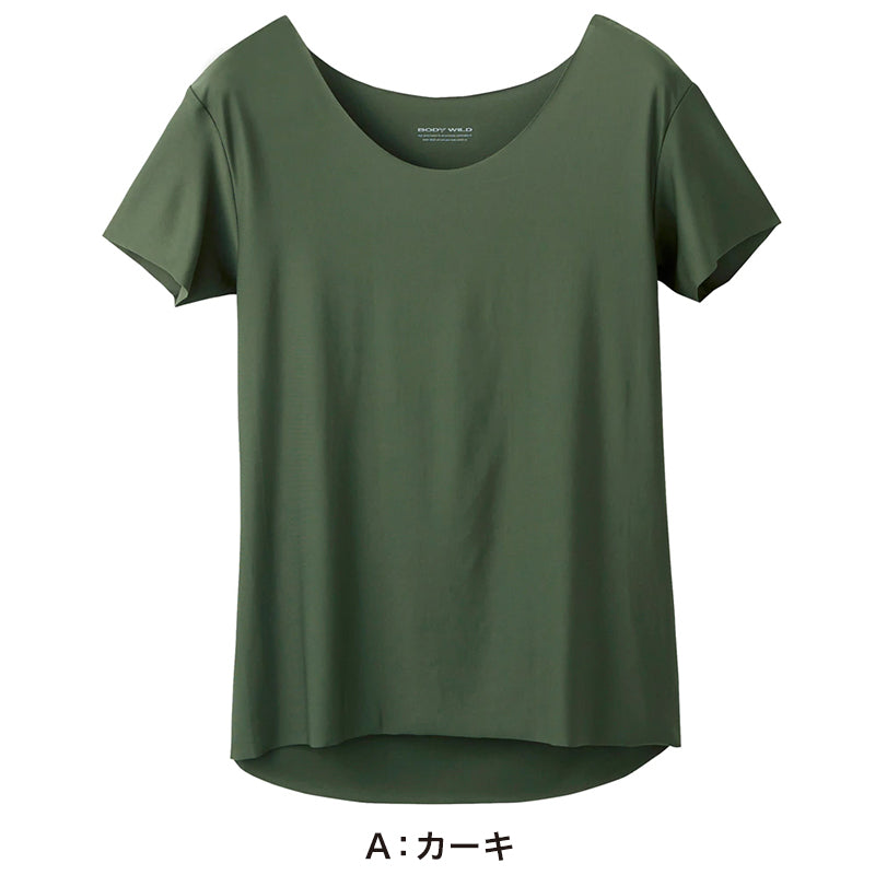 丸首Tシャツの下に着ても首元から覗かないボートネックタイプ。