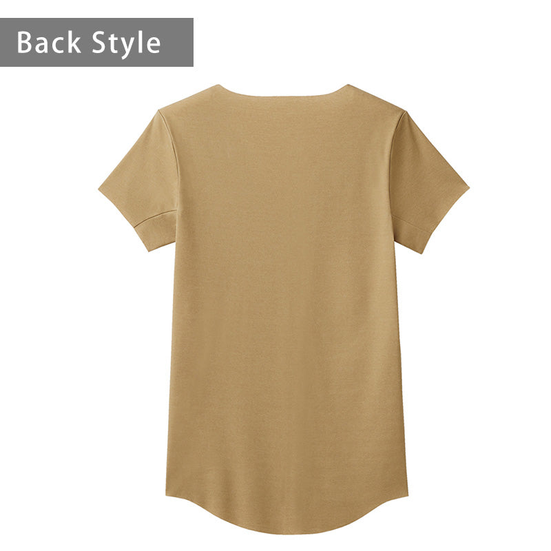 襟元からインナーが覗きにくいネックラインと、かがんでも背中が見えにくい後ろ丈長めの立体前後設計。
