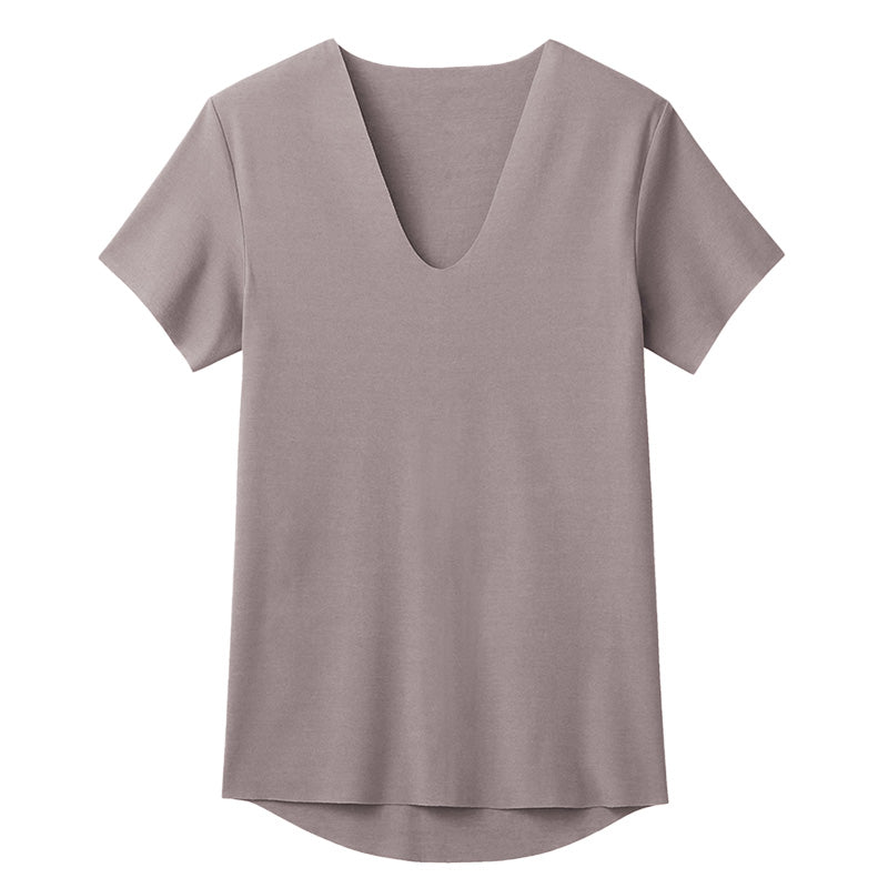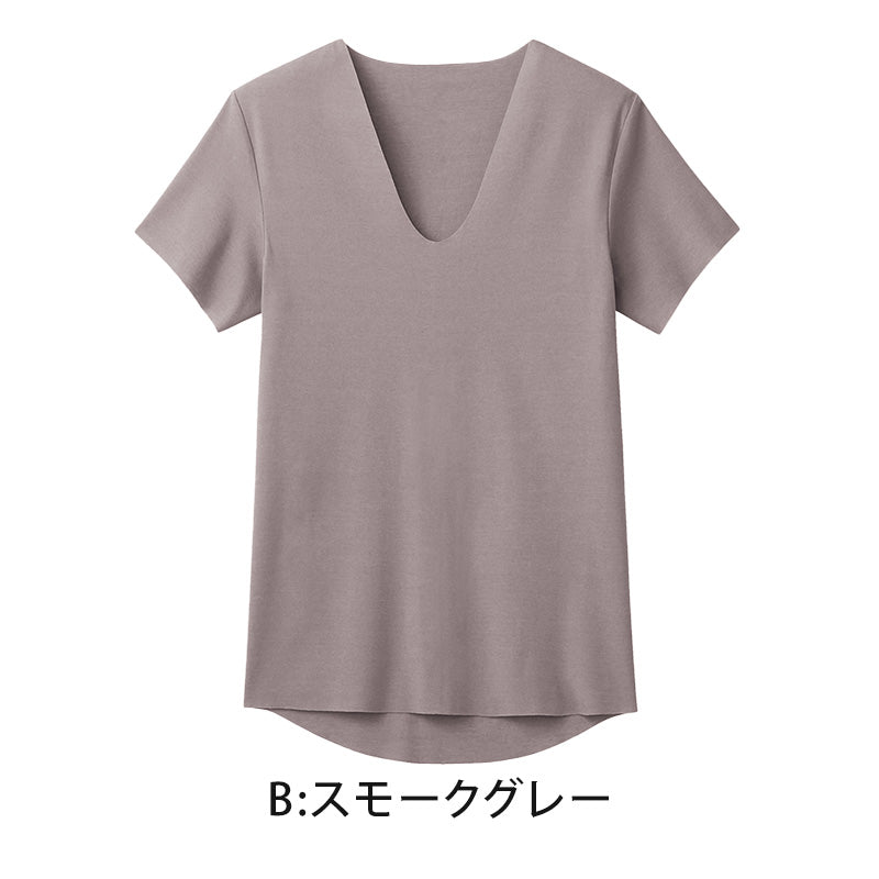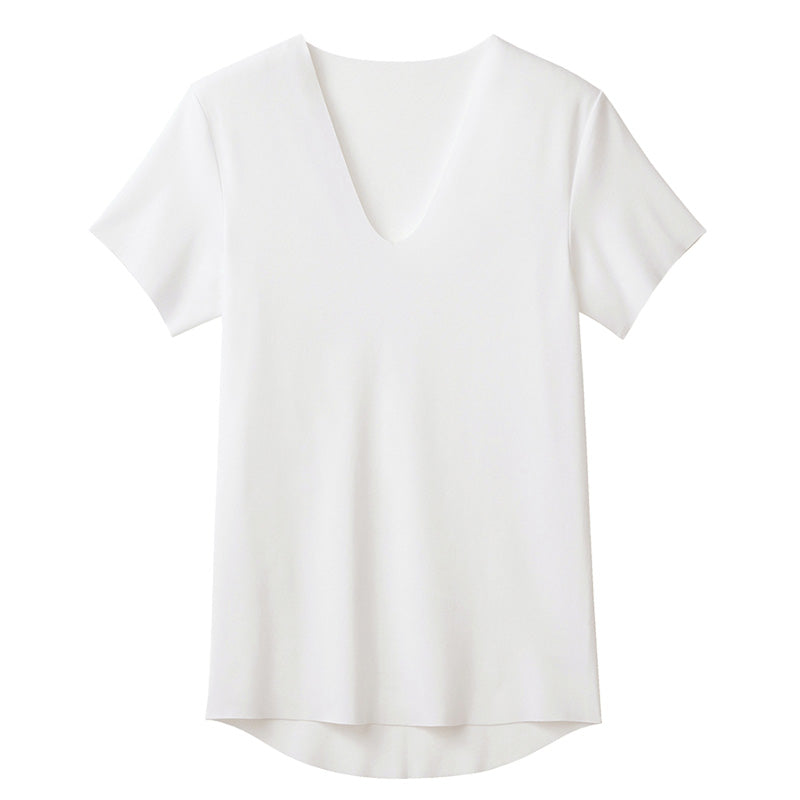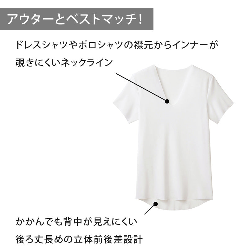 襟元からインナーが覗きにくいネックラインと、かがんでも背中が見えにくい後ろ丈長めの立体前後設計。
