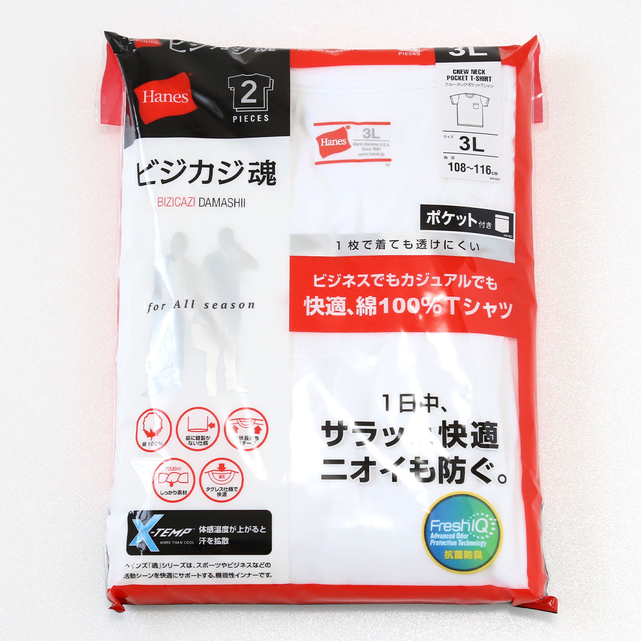 ヘインズ Tシャツ 綿100% メンズ 2枚組 白 黒 ポケット付き ビジネス ビジカジ魂 インナー スーツ カジュアル 抗菌防臭 3L-4L Hanes 3L 4L 男性 紳士 下着 カジュアル オフィス スマート フォーマルカジュアル (在庫限り)
