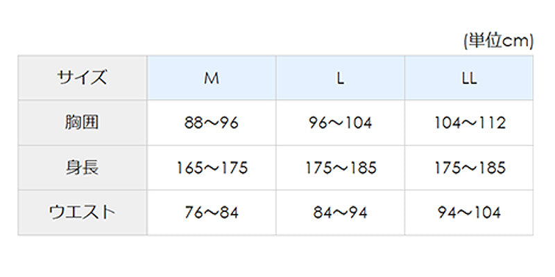 L(身長:175-185cm/胸囲:96-104cm/ウエスト:84~94cm)