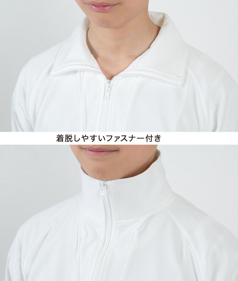 着脱しやすいファスナー付きです。袖口、裾が伸縮するため動きやすく、首元には名前が書けるラベルが付いています。